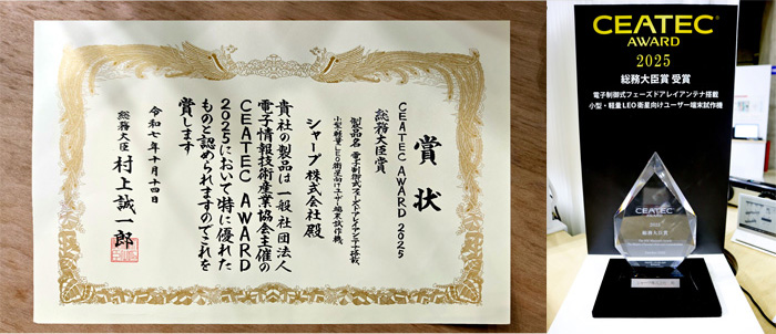 シャープが開発中の5G NTN通信対応 LEO衛星通信ユーザー端末(※1)が、「CEATEC AWARD 2025」において『総務大臣賞』を受賞しました。