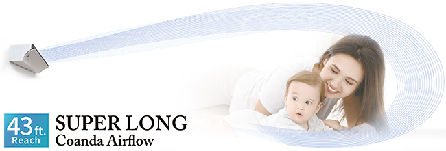 また「コアンダ※4エアフロ―」技術により、風を天井や壁に沿わせて遠くまで(最大13メートル)届け、部屋全体を効率よく、かつ身体に直接風を当てずに冷暖房します。