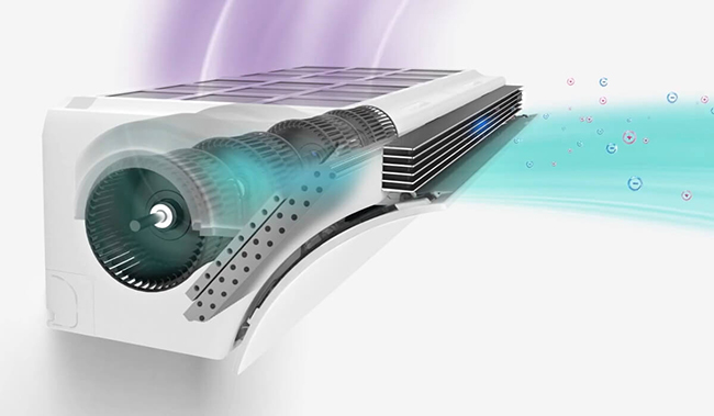 高密度の高性能フィルターを採用すると空気抵抗が大きいため、従来型のクロスフローファンでは十分な風量を確保できません。そのため、Airestは4つの強力な遠心ファン(centrifugal fan)を搭載することで高い圧力を生み出し、フィルターを通しても勢いのある風を送り出します。