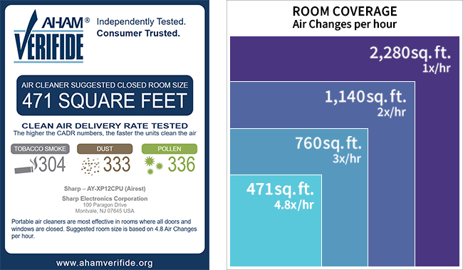 - CADR(Clean Air Delivery Rate:クリーンエア供給率):AHAMが定めた重要な指標の一つ 日本での「〇〇畳用」にあたる、空気清浄機能を数値化する現地規格