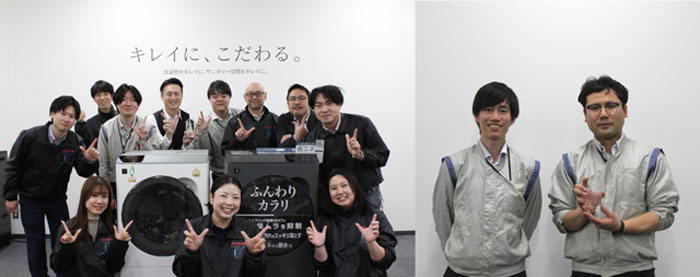 (左写真上段左から)Smart Appliances & Solutions事業本部 清潔ランドリー事業部 国内商品企画部 課長 吉岡 直哉、主任 石川 寛、同事業部 洗濯機技術部 技師 長友 芳郎、課長 柴田 遼、部長 鈴木 裕之、同事業本部 デザインスタジオ デザイナー 斎藤 直樹、