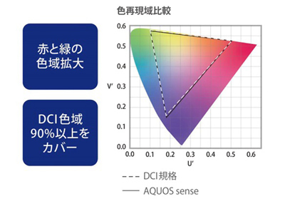 ・液晶テレビ「AQUOS」の技術を受け継いだ「リッチカラーテクノロジーモバイル」を搭載。デジタルシネマの標準規格(DCI※3)に対応した高い色再現性により、実物に近い色鮮やかな映像を映します。
