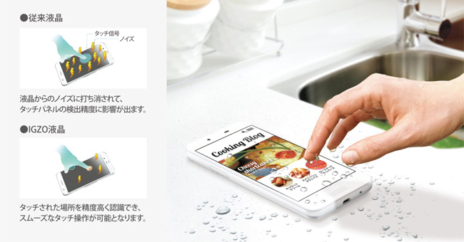 ・IGZO液晶ディスプレイの特長を生かした独自のタッチパネルチューニングにより、お風呂など画面や指が水に濡れていても誤動作が少なくスムーズに操作できます※4。