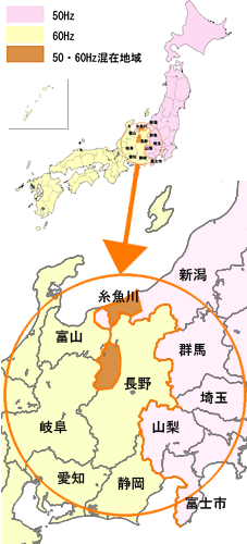 | ● | 電力会社から一般家庭に供給されている電気は、交流といわれ、電気のプラス(+)、マイナス(−)が1秒間に何十回と入れ代わっています。その入れ替わる回数が周波数(Hz:ヘルツ)と呼ばれるものです。一般的には、これを「電源周波数」と呼んでいます。 |