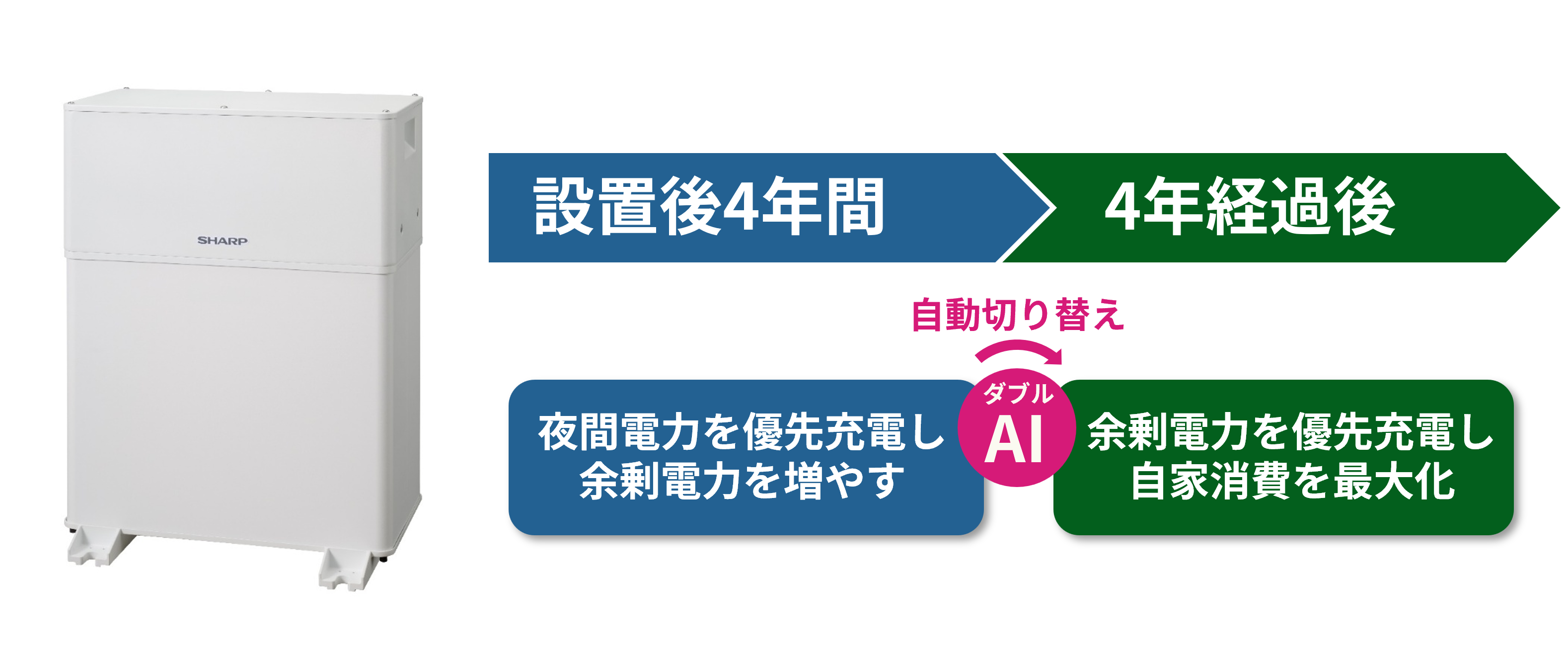1.買取単価の高い設置後4年間は、AIが日中の消費電力量を予測し、必要な分だけ充電。可能な限り売電するよう制御