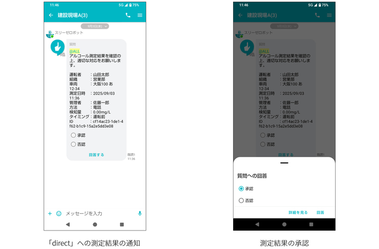 「direct」は、建設やインフラ、製造など、運転業務の多い業界をはじめとする5,500社以上に導入されている現場向けビジネスチャットです。今回の連携により、運転者が市販のアルコール検知器(※3)で測定後、「スリーゼロ」アプリから結果を送信すると、「direct」のトークルームに自動で投稿できるようになりました。安全運転管理者は、トークルーム上で測定結果を確認し、すぐさま点呼や承認が可能です。日々使用する業務チャット上での管理を実現したことで、さらなる業務効率化に貢献します。また、トークルームのグループ設定も簡単にできるので、案件ごとに運転者が入れ替わるプロジェクトや現場においても活用いただけます。