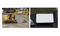 左:衛星通信ユーザー端末を上部に設置した建設機械、右:建設機械上部に設置された衛星通信ユーザー端末
