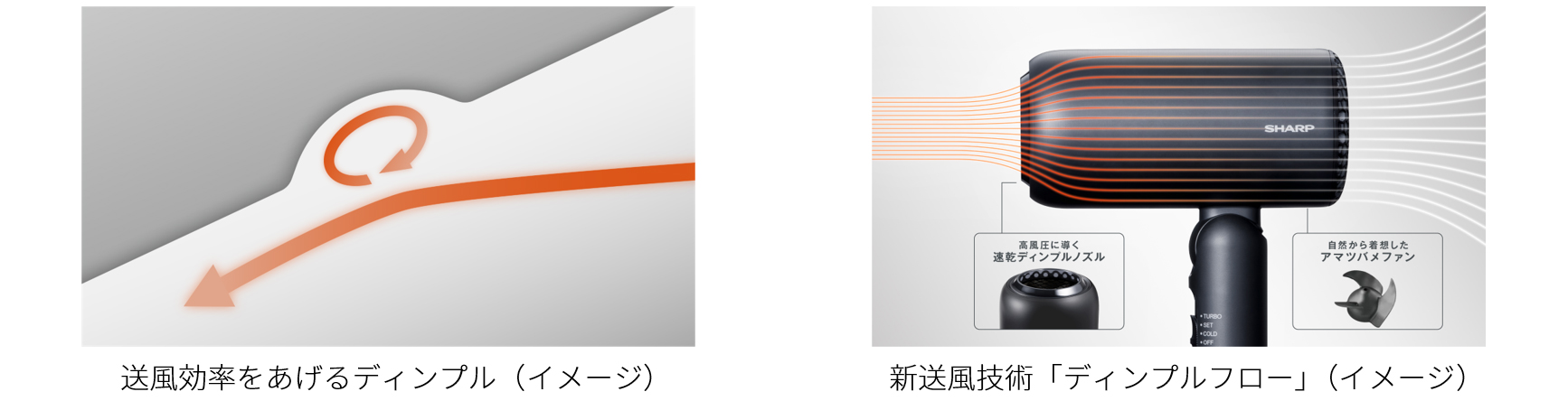 1.高風圧に導く「速乾ディンプルノズル」と「ネイチャーテクノロジー」を活用した「アマツバメファン」でコンパクトながら高い速乾性能を実現