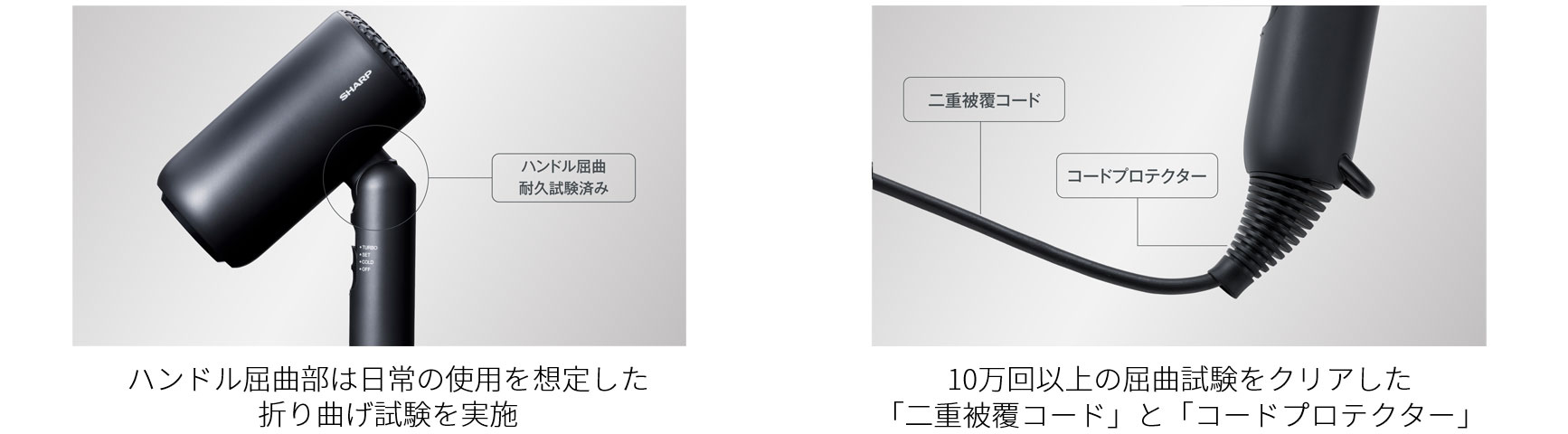 また、電源コードには耐久性を高める「二重被覆コード」と「コードプロテクター」を採用。ドライヤーの故障原因の一つであるコード断線に配慮した設計で、10万回以上のコード屈曲試験もクリアしています。さらに、静電気を抑えキューティクルを保護するマイナスイオンを搭載。紫外線ダメージからも髪をまもります。