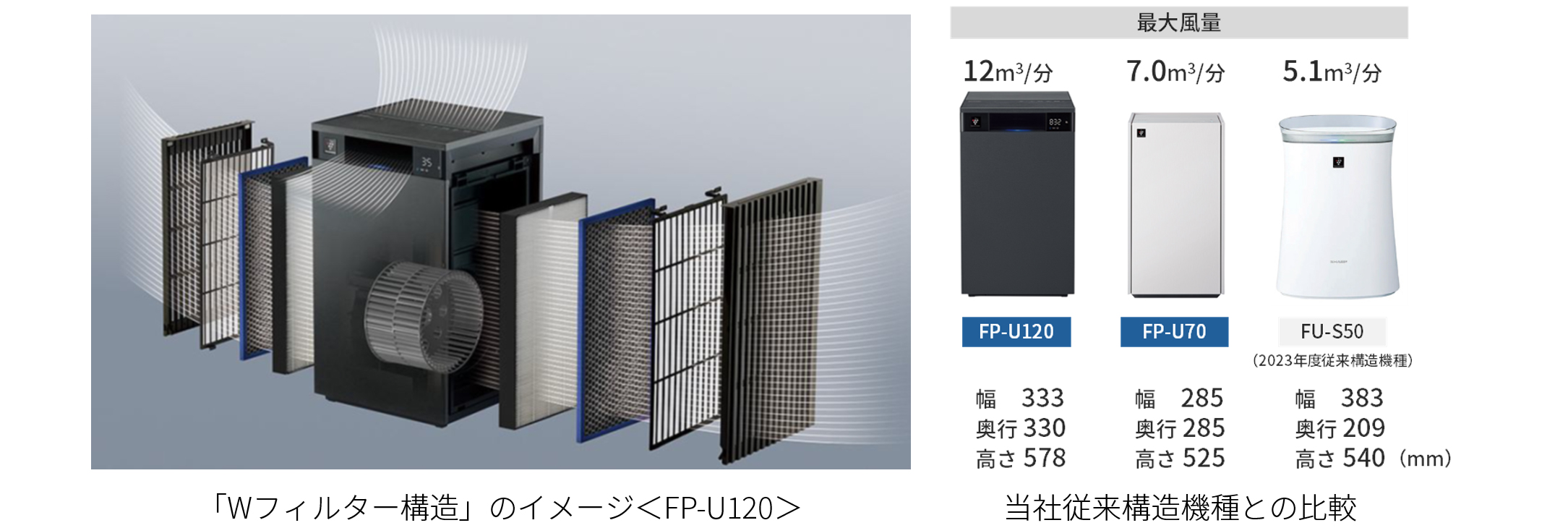本シリーズは、本体左右の側面に集じん(静電HEPA)・脱臭フィルターを設けた「Wフィルター構造」を採用し、本体サイズをコンパクトに抑えながら、広いフィルター吸い込み面積を確保しました。本構造の採用により、少ないファンの回転数でも効率よく空気を送り出すことが可能です。<FP-U120>の「自動」運転時には、低騒音36dBながら、23畳の空間まで清浄可能な高い空気清浄性能を実現しました。また、<FP-U70>の「自動」運転時は、低騒音31dBで12畳の空間まで清浄できます。
