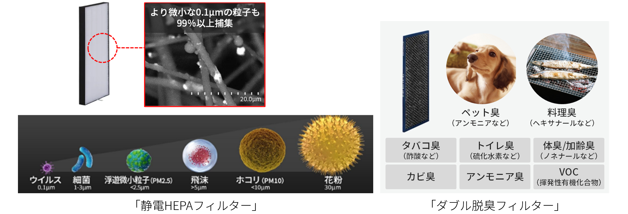 2.0.3μmの微小粒子を99.97%以上捕集する「静電HEPAフィルター」、ペット臭や汗臭を脱臭する「ダブル脱臭フィルター」を搭載