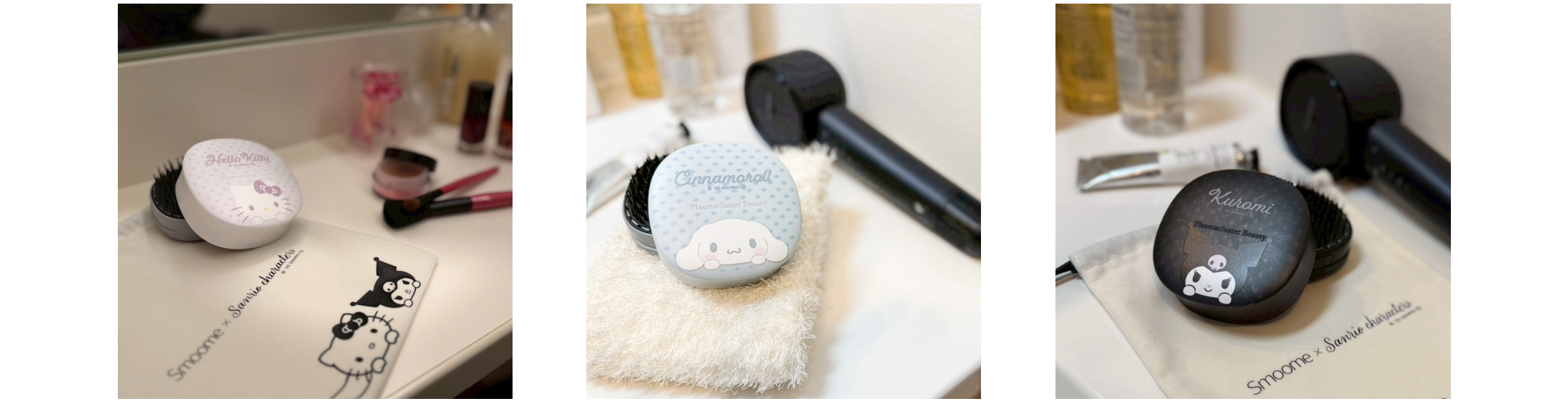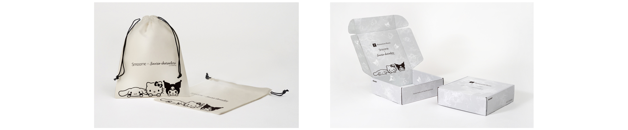 今回の限定モデルは、株式会社サンリオのキャラクターであるハローキティ、シナモロール、クロミをデザインし、“かわいさ”や“親しみやすさ”を取り入れています。さらに、外出時の持ち運びに使用できる巾着を付属。各キャラクターのデザインつきで、高級感のあるベロア質感の素材を採用しました。加えて、製品パッケージの内側にもキャラクターをあしらい、プレゼントの際のギフトボックスとしても活用いただけます。