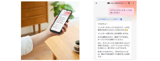 本シリーズは、エアコンで初めて生成AIサービスに対応しました。「COCORO HOME」アプリ内の「COCORO HOME AI」から、スマートフォンなどを用いて、手軽に使用できます。エアコンの使い方やお手入れ方法などの質問をテキストで入力すると、取扱説明書や製品FAQなどのデータベースをもとに自然な言葉で回答します。運転モードの提案時には、回答とともに設定画面に誘導してくれるので、簡単に変更できます。