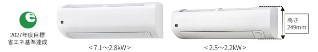 ※5 国内家庭用エアコン 2027年度目標省エネ基準達成モデルにおいて。2.5kW、2.2kWクラス 室内機高さ249mm。2026年1月27日現在(当社調べ)。
