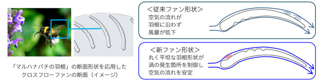 <AY-U71RL2~U28RL>の室内機のファンに、新たに「マルハナバチの羽根」の断面形状を応用した「ネイチャーテクノロジー」を採用しました。マルハナバチの羽根の断面は、先端が丸く平坦な形状をしています。羽根の周りの凹凸部分に渦を発生させることで、摩擦抵抗をなくし、空気の流れをなめらかにしています。ファンに、この羽根の形状を応用することで、渦の発生箇所を制御し、安定した空気の流れを実現。送風効率を、当社従来ファン搭載時と比べ、約4%向上(※11)させ、省エネ性を高めました。