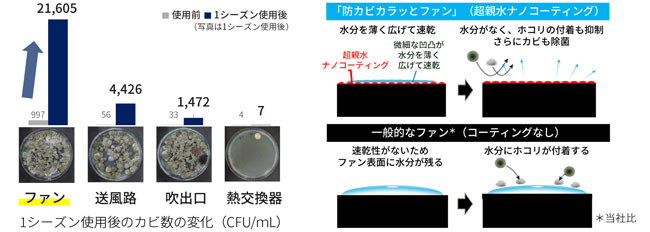 カビの増殖原因は「水分」と、炭素などの栄養を含んだ「ホコリ」です。カビの増殖を抑えるには、まず湿度(水分)対策が重要です。エアコンにおいては、特に冷房運転時に、内部の湿度が非常に高くなるため、カビが増殖しやすい環境にあります。今回、エアコン内部において、特にカビが多くひそむのは「ファン」であることがわかりました。そのファンの水分を速く乾かすことは、エアコン内部のカビ増殖を抑えるために、非常に有効な手段です。