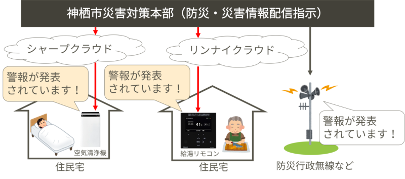 本実証実験では、災害対策本部や避難所に加え、市内在住の防災士の自宅にIoT対応かつ発話機能を備えたシャープ製の空気清浄機もしくはリンナイ製の給湯リモコンを設置します。避難訓練において、これらの機器から訓練情報を発話。このほか防災行政無線や防災ラジオ、神栖市公式LINEなどで伝えます。空気清浄機は、将来的に居住エリアに応じた災害情報を発話する仕組みの構築に向けた検証として、世帯ごとに異なる内容の発話も行います。避難訓練実施後、参加した市民へのヒアリングなどを通じて、災害発生時の情報伝達手段として、IoT・発話対応の家電や住設機器の有効性を確認します。