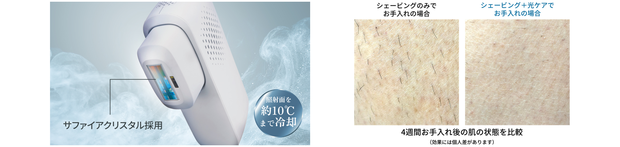 ※1 業務用美容技術を応用した冷却機能「JeweL冷却」を搭載。約2週間のお手入れでムダ毛が目立ちにくくなったと実感。測定部位:脚(12名)。*効果には個人差があります。