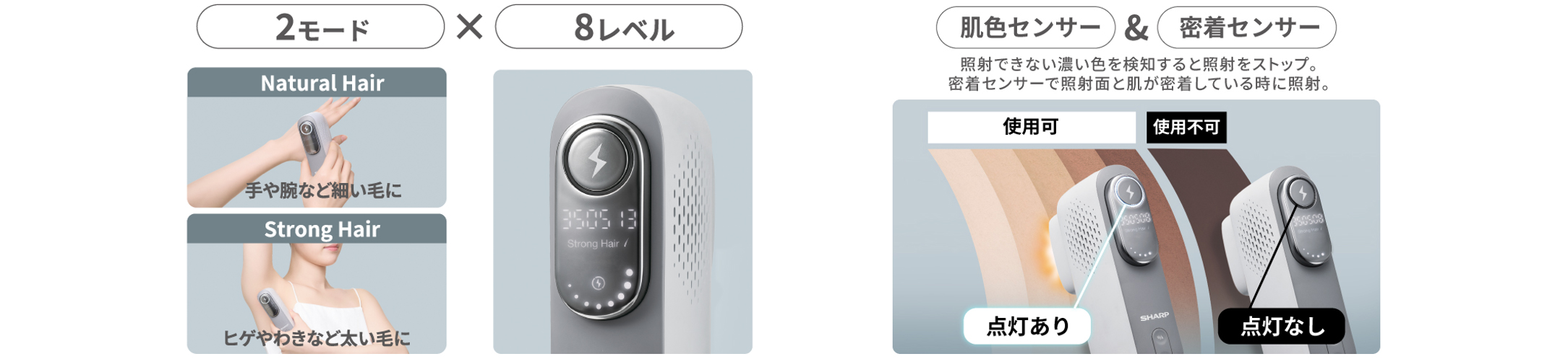 太い毛のケアにおすすめの「Strong Hairモード」と、細い毛のケアにおすすめの「Natural Hairモード」の2モードを搭載。各モードにおいて8段階の出力調整ができ、肌の状態や部位に合わせてお使いいただけます。VIOや男性のヒゲへの照射にも対応し、1台で全身のケアが可能(※5)です。また、肌の色を検知して照射を制御する肌色センサーや、照射面が肌に正しく当たっているときのみ照射する密着センサーも搭載し、安全面にも配慮しています。